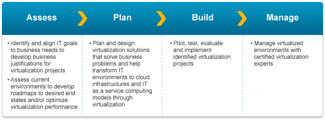 Based on best practices from working with thousands of customers and using reliable, repeatable methodologies, our services are designed to help you: Assess your current environments, Plan and design solutions that meet your desired business objectives, Build and implement your desired virtualization solutions, and Manage your environment with staff augmentation and performance tuning.